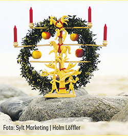 Wenn Herbst und Winter mit brausendem Wind und schäumenden Wellen daherkommen, wird es Zeit, es sich drinnen so richtig gemütlich zu machen. Bei heißem Punsch, duftendem Tee oder an einem prasselnden Kaminfeuer – nach einem Spaziergang in der klaren, kalten Luft sind das genau die richtigen Zutaten, sich wieder aufzuwärmen. Für Entschleunigung pur in der oftmals so hektischen (Vor-)Weihnachtszeit und eine besonders zauberhafte Stimmung auf der Nordseeinsel sorgen zudem hübsche Advents- und weihnachtliche Dekorationen. Dazu gehört auf jeden Fall der traditionelle Jöölboom, der in der Advents- und Weihnachtszeit in keinem Haushalt fehlen darf. Ein Brauch, der bereits zu Anfang des 19. Jahrhunderts entstanden ist, als Weihnachtsbäume in Mode kamen, auf Sylt aber kaum zu finden waren. Der klassische Jöölboom besteht aus einem Holzgestell, das mit grünem Blattwerk, kleinen Tonfiguren, die das Leben symbolisieren sollen, Äpfeln und Kerzen schön verziert ist. Doch nicht nur die Häuser strahlen im Festtagsglanz. Auf der Insel selbst zaubern viele Lichter eine besonders schöne Atmosphäre. Überall glitzert es verheißungsvoll, erst recht, wenn mal wieder etwas Schnee fällt – dann erscheint Sylt wie ein wahres Märchenland. Ab Ende November laden die Adventsmärkte ein, sich bei schönem Kunsthandwerk sowie bei Mandel- , Waffel- und Punschduft auf die Weihnachtszeit einzustimmen.